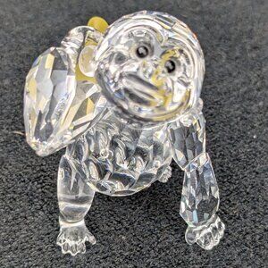 This Swarovski crystal young gorilla was part of the “Rare Encounters” series. The young gorilla is made from clear facetted crystal with dark crystal eyes, and he is carrying a bunch of jonquil crystal bananas over his shoulder.