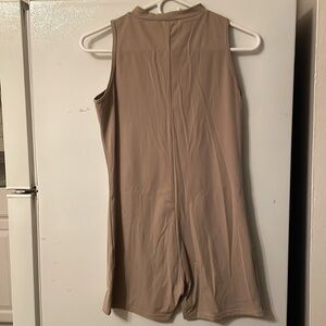 This tan one piece from PrettyLittleThing features a sleek high neckline and a fitted silhouette, offering a minimalist and versatile style. Crafted from a structured fabric, it maintains its shape beautifully, making it a chic choice for various occasions.