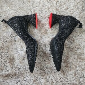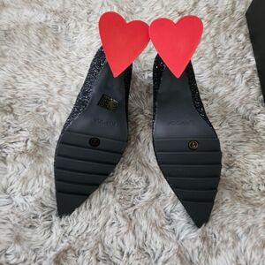 Pointed toe black glitter pumps with heart shaped heels