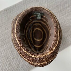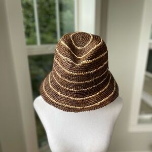 Eddie Bauer straw bucket hat in brown with tan stripes. Can be worn with the brim flipped down as a bucket hat or flip the rim up for a different look. Unisex. Size S-M fits better on women’s head.