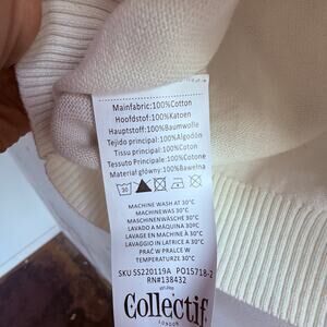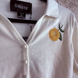 NWT Collectif cotton cardigan top in ivory, finished with twin lemon embroideries at the chest. Cropped, fitted silhouette with an open collar, covered buttons, and short puff sleeves. The 100% cotton knit keeps it breathable while the fruit detail gives it that retro-pinup meets cottagecore charm.