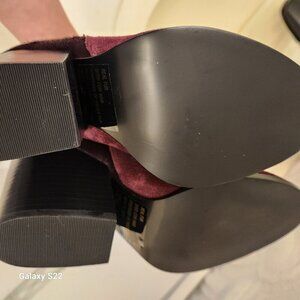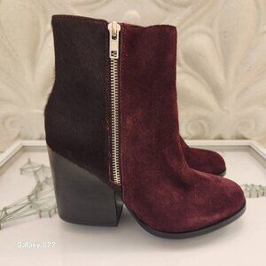 Steve Madden "TStudio" Peace and Love Booties. NWT. Size 5.5. Leather and Calf hair. No rips/stains/scuffs or tears. Side zips. Block heel. Heel height: 3.75 inches. Rounded toe. Color is a Burgandy/Wine. So pretty. No box. The only tags are the description tags on the bottoms. Smoke free home. No odors. All offers are welcome. Thank you!