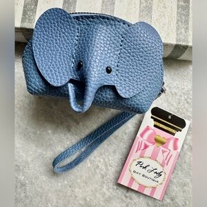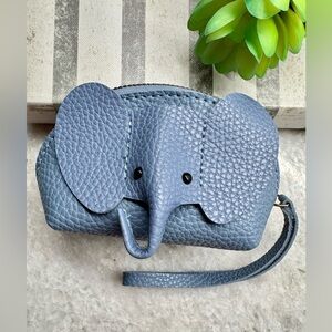 This blue faux leather elephant coin purse/small wristlet is adorable and functional. It features a zippered closure, wristlet strap, and interior key ring.