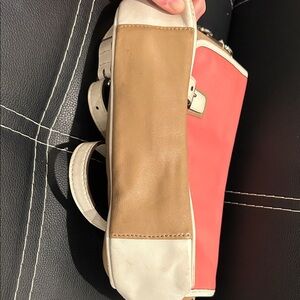 Chic Coach satchel in coral and beige leather. Features dual buckle accents and adjustable strap.
