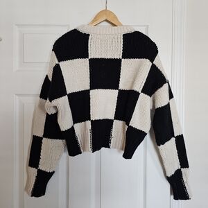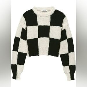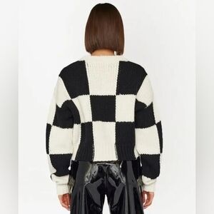 Checkered merino wool jumper from FRAME featuring black/white, merino wool, knitted construction, checkerboard knit, ribbed trim, round neck, balloon sleeves, fitted-cuff sleeves and straight hem.