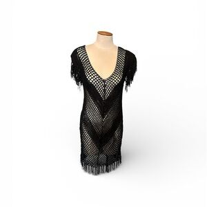 Turn heads at the beach or poolside with this stunning black crochet swim cover-up. Handcrafted with a soft, open-knit fishnet design, this lightweight and breathable cover-up features a flattering deep V-neckline and chevron patterns that add a touch of bohemian flair. The short sleeves are accented with playful fringe, and the hem is finished with delicate tassels for a free-spirited vibe.