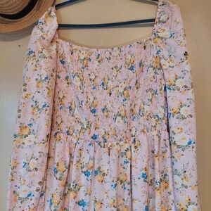 Charming floral print dress. Features long sleeves and a smocked bodice. Perfect for casual outings. Can be worn off-shoulder.