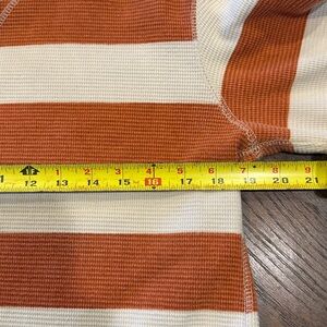 Embrace comfort and style with this cozy striped crew neck sweater. The rust and cream stripes add a touch of warmth to your casual wardrobe.