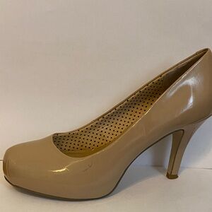 Chic and glossy boho formal beige heels. Perfect for elevating any outfit. Comfortable and stylish.