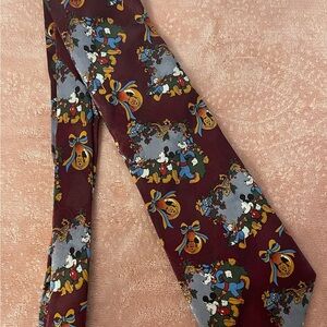 Burgundy tie featuring Mickey Mouse and friends. Colorful and playful design. Perfect for Disney fans.