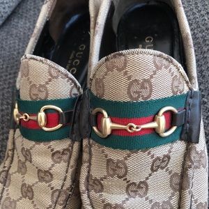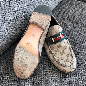 Stylish Gucci loafers with signature pattern. Features green and red accents. Comfortable and chic design.