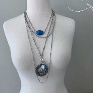 Gorgeous layering necklaces from Katia Designs. Can be worn multiple ways (see her YouTube videos for examples). The Yin Yang necklace has a beautiful 2 inch diameter pendant which has "breathe" engraved on the back. The other necklace has a 1.25 inch oval turquoise stone.
