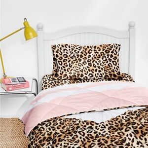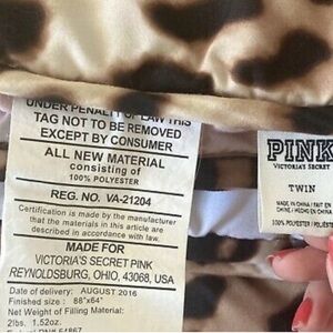 Bold leopard print with vibrant pink highlights. Adds a chic touch to any bedroom.🌸Vs Pink bed in a bag - comes with comforter ( sheet set ) & 2️⃣ Leopard Print Pillow Cases - This is not new - but in Great condition- ( has 2 spots on the comforter AS SHOWN IN PICS) I have not taken the time out to spot treat - Super Cute Twin Set 🌸 Reasonable offer welcome -