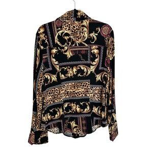 A stylish snap front knit shirt boasting a bold black base adorned with an opulent gold baroque pattern and fierce leopard print accents. This long sleeve top features a classic collared neckline and a deep V neck. It's perfect for making a statement. Ideal for a night out or a chic office ensemble. Made in USA