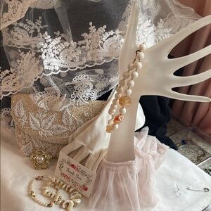 its a stunning accessory for any event. The intricate cream beadwork adds a touch of elegance to your outfit. Perfect for evening occasions or a fashionable day out.Measures 9 in wide ,5 in tall ,its missing a few beads on the outside this was designed probably in the 50-60 inside shows some wear of use of getting your make up and lipstick out but she’s beautiful, comes from Pet and smoke free home