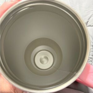 Stylish pink water bottle with strawberry design. Features a convenient handle and secure lid. Perfect for hydration on the go.