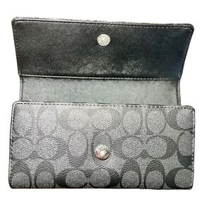 Classic Coach long snap wallet featuring the iconic signature “C” canvas with a sleek black and gray colorway and gold-tone Coach logo hardware.