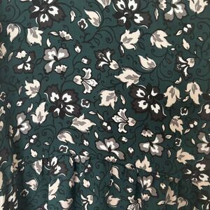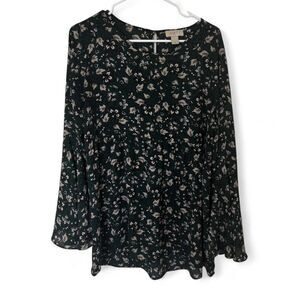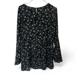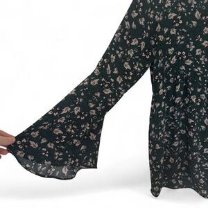 LOFT Dark Green floral bell sleeve blouse/tunic. This is a longer blouse, good for pairing with leggings. #floralblouse #bellsleeves