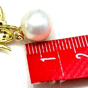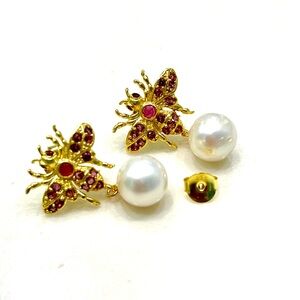Exquisite bee earrings made with genuine ruby and freshwater pearls (9-10 millimeters). They are set in 925 sterling silver plated with yellow gold. The craftsmanship is amazing!