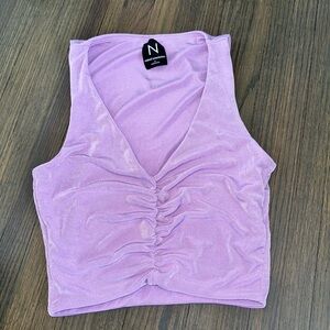 Chic lilac crop top with ruched front. Sleeveless design. Soft and stylish.