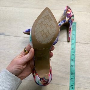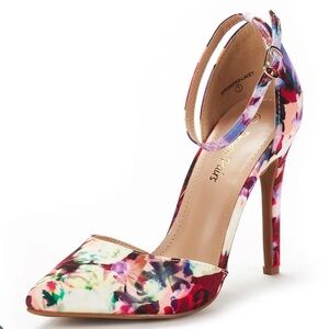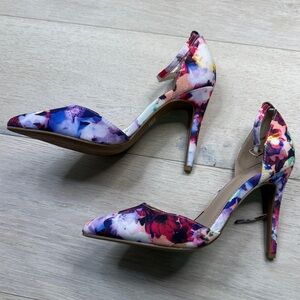Elegant floral heels with ankle strap. Perfect for adding flair to any outfit.