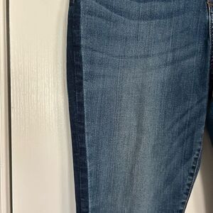 Cropped, frayed hem, dark blue wash along the side of the legs. No flaws. Perfect condition.