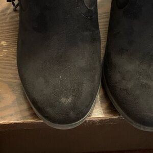 Black boots with fringe. Small heel. Small smudge on toe ( pictured)
