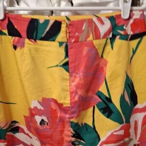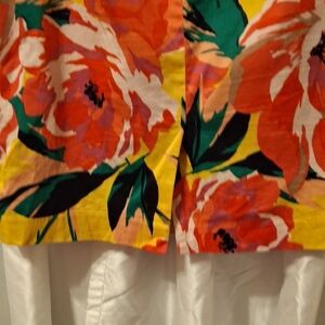 This knee-length pencil skirt by Ann Taylor features a vibrant yellow base adorned with bold orange floral patterns, perfect for a casual resort setting. Fully lined. structured fabric ensures a flattering fit, while the artistic floral design adds a touch of tropical elegance to your wardrobe.
