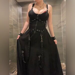 Edgy black maxi dress with buckle accents. Striking strap details. Ideal for a bold statement.