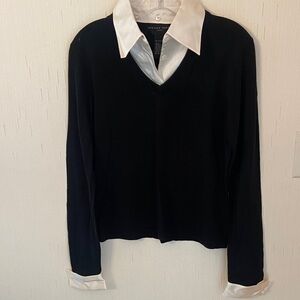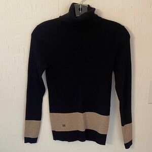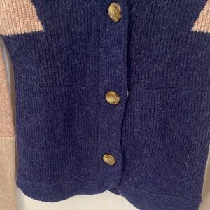 Chic blue and tan cardigan with button closure. Ideal for layering.