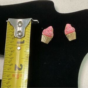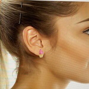 Adorable pink cupcake earrings with gold accents. Perfect for adding a playful touch to any outfit.