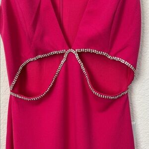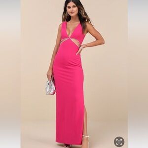 Elegant pink maxi dress by Lulu's. Features rhinestone chain detailing. Perfect for special occasions.