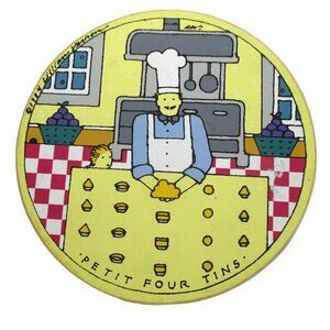 This 1984 collectible set by Lillian Vernon includes 12 metal petit four tins in unique shapes, housed in a charmingly illustrated wooden box.