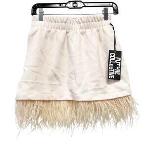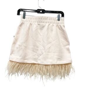 Stylish mini skirt with feather trim, elastic waistband for comfort, and versatile cream color. Cotton blend fabric offers softness and durability.