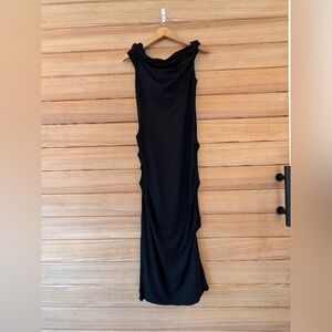 Slouchy design meets an elegant silhouette in this lightly ruched drop-shoulder gown by Paris Georgia.