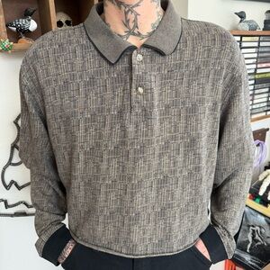 True vintage 60's Woolrich wool button down shirt in an earthy gray, tan and brown plaid colorway with two button flap patch pockets at the chest
