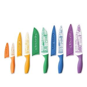 Color kitchen prep with this sharp set of cutlery essentials from Cuisinart, featuring five printed knives, each with its own coordinating blade guard. Color-coded design helps you keep tabs on what you're cutting to avoid cross-contamination. Stainless steel blades have nonstick ceramic coatings to slide through foods.