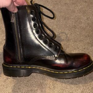 These are a rare find a retail for 180 brand new. Please send reasonable offer this brand of Boots will last you a lifetime they do not wear down easy. Please send a reasonable offer. Stylish black leather boots with cherry stain finish, with double zipper and lace-up design. Features a side zipper for easy wear as well as front. These are gently worn like new with the worn look and feel. Please see photo of the style. The coloration is purposeful design of product and not defect. It’s supposed to have the tarnished look and appeal appearance.