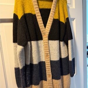 Chic and warm striped cardigan. Features a V-neck and button closure. Perfect for layering.