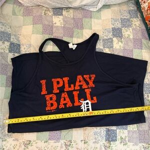 Blue & orange Detroit Tigers tank top with bold orange 'I Play Ball' text. Under Armour logo at the bottom left.