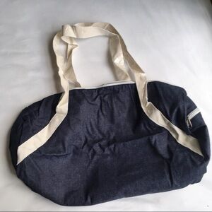 Private Party Gym Bag in Denim wash. Gym bag with cotton handles, outside zipper pocket & inside open pocket. Perfect for the gym, yoga, barre, spin, or everyday use. 20"W x 9"H. Brand new in package (package only opened for pictures).