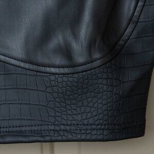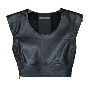 Maniere de Voir Wide Shoulder Crop Top Black Goth Dom 90s Club Rave Embossed, size 4. This is a faux leather crop top with bust detail and a bodice or corset style. The strong shoulder is a shoulder pad and it has a futuristic cyberpunk style.