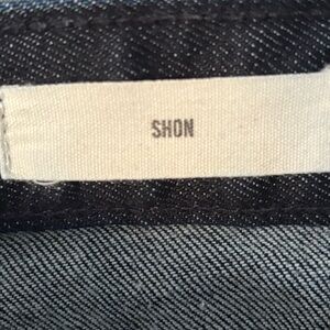 Mid-rise, relaxed fit barrel leg jean in Japanese stretch denim. Uniquely curved silhouette. Seam detail at knees. Gusset at inseam. Zip fly. Shank closure. Top-stitched front and back patch pockets.