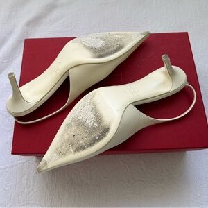 Chic Valentino heels with a cream finish and gold detailing. Ideal for a sophisticated look. So comfortable ! Very good pre-owned condition with light, normal signs of wear on the heels (please see photos). Structurally sound and well maintained.I wore one time for a dinner party! I get a lot compliments
