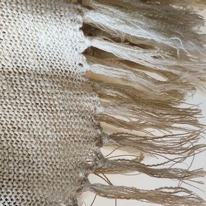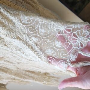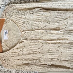 Beautiful crocheted lightweight sweater with lace insets at each hip. Tie front. Great for layering.