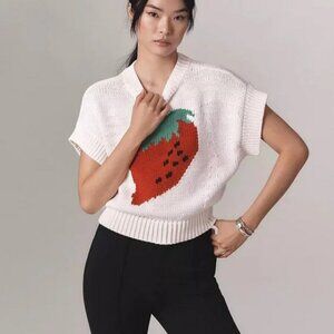 Anthropologie Maeve Pippa Sweater Strawberry Knit Intarsia 60s Whimsical Crew Neck Pullover, size Medium.