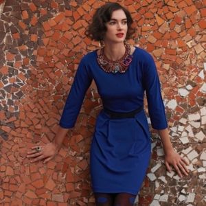 Anthropologie Girls from Savoy Ponte Sapphire Blue Dress Black Velvet Belt