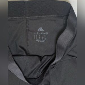 The Adidas Base Layer Women's Black Alphaskin Aeroready Capri Legging in size I is a solid black leggings designed for active women. These leggings feature a pull-on closure and compression focused on the legs, with a skinny leg style and a 28-inch waist with a 22-inch inseam. Made from a blended fabric, they offer moisture-wicking properties for added comfort and performance during activities like gym training, yog: or running. The Adidas Alphaskin Acrorcady product line ensures a quality fit for outdoor, athleisure, or sports-themed occasions in all seasons.