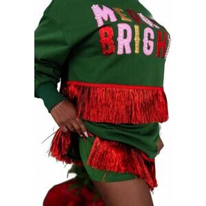 Elevate your holiday wardrobe with the Tinsel Fringe Skort by Brianna Cannon, a perfect choice for winter gatherings. Crafted from a textured cotton blend, this skort features soft white terry sweatshirt material with eye-catching metallic red fringe, while its pull-on design and elastic waistband ensure comfort. The skort includes practical pockets and attached athletic shorts underneath for additional ease. Care: Hand wash and line dry. Available in sizes ranging from XS to L with specific measurements to ensure the right fit.