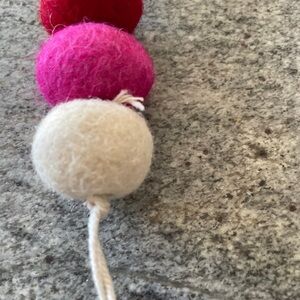 Vibrant felt ball garland with red, pink, and white balls. Perfect for decoration.